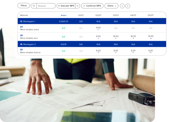 Faça seu planejamento mestre da produção com uma visão de longo prazo. Utilize o MPS para gerar materiais de forma organizada e, em seguida, sequencie todas as etapas em questão de segundos com o auxílio do APS.